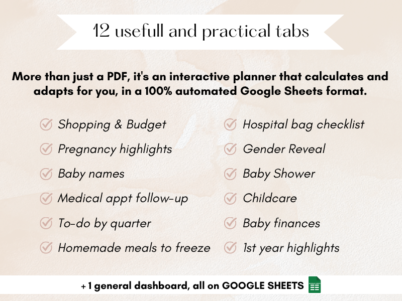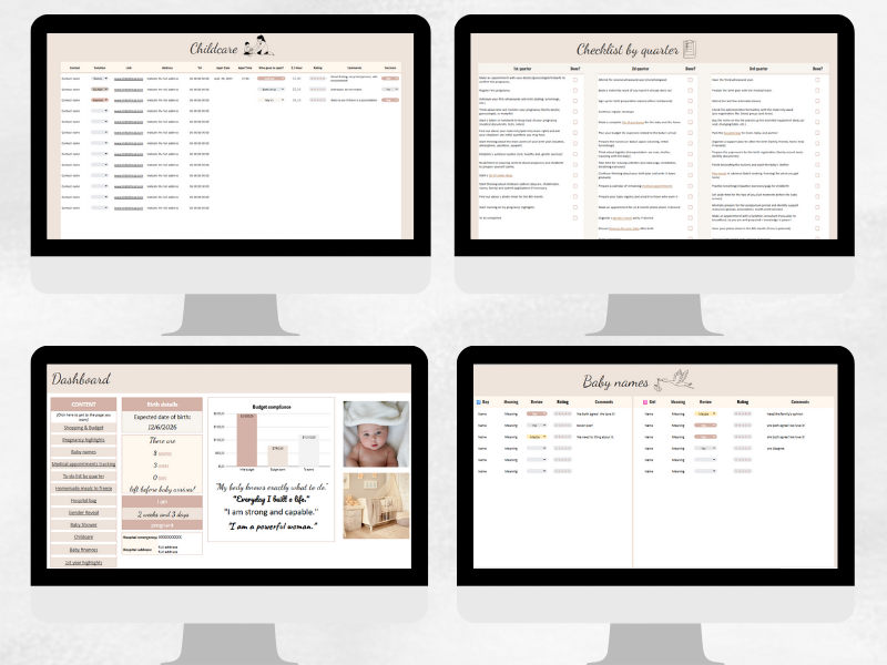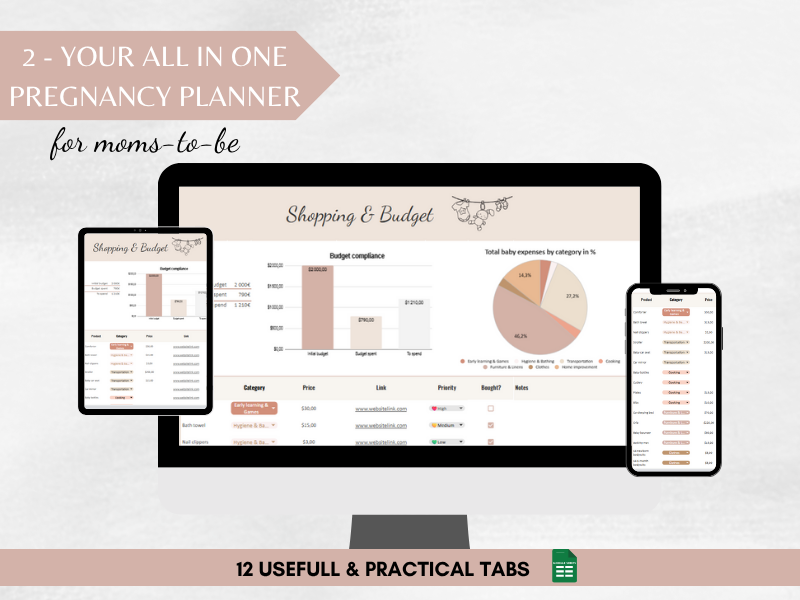 📘 Pregnancy tracking spreadsheet: plan your medical appointments, prepare your baby shopping list, track your budget, organize childcare, plan your meals, and more.